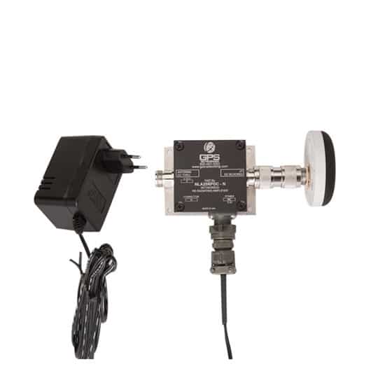 The Variable Gain L1/L2 GPS Portable Re-Radiating Kit (VGL1/L2PNRRKIT) is a re-radiating (GPS repeater) system that allows re-radiation of the GPS L1 & L2 signals indoors. The VGL1/L2PNRRKIT consists of a re-radiating amplifier with variable gain, a wall mount plug-in transformer that powers the entire system and a passive L1/L2 re-radiating antenna. The GPS L1 & L2 signal from the roof antenna is amplified, adjusted as necessary with the pot range control and radiated indoors. Thus, if a receiver has line of sight with the re-radiating antenna, it can receive the GPS signal indoors up to 100 feet away.